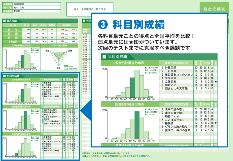 テスト受験後には全国の受験者の中でのランキングや、弱点、単元別の正答率など総合成績表をお渡しいたします。